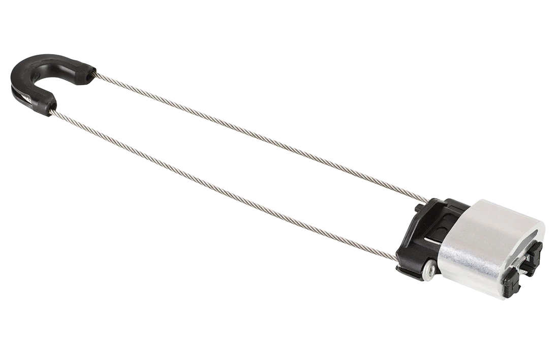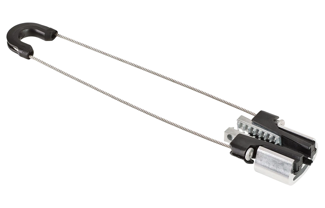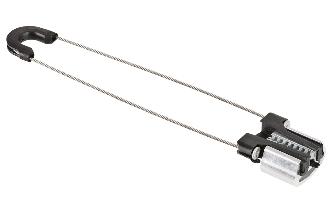 Предназначен для крепления и поддержки кабеля с обеспечением требуемого натяжения кабельной линии. Состоит из открытого конического корпуса, пары металлических зубчатых клиньев (зажимное устройство) и гибкой петли. Все детали соединены между собой и не могут быть утеряны. Устанавливается парами в начале, конце и в интервале 5-ти опор по протяженности кабельной линии. Обеспечивает значительное сокращение продолжительности процесса подвес кабеля.- Длина петли, мм: 260