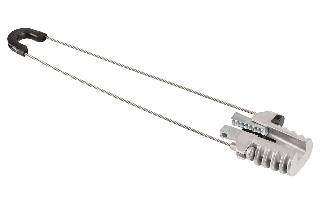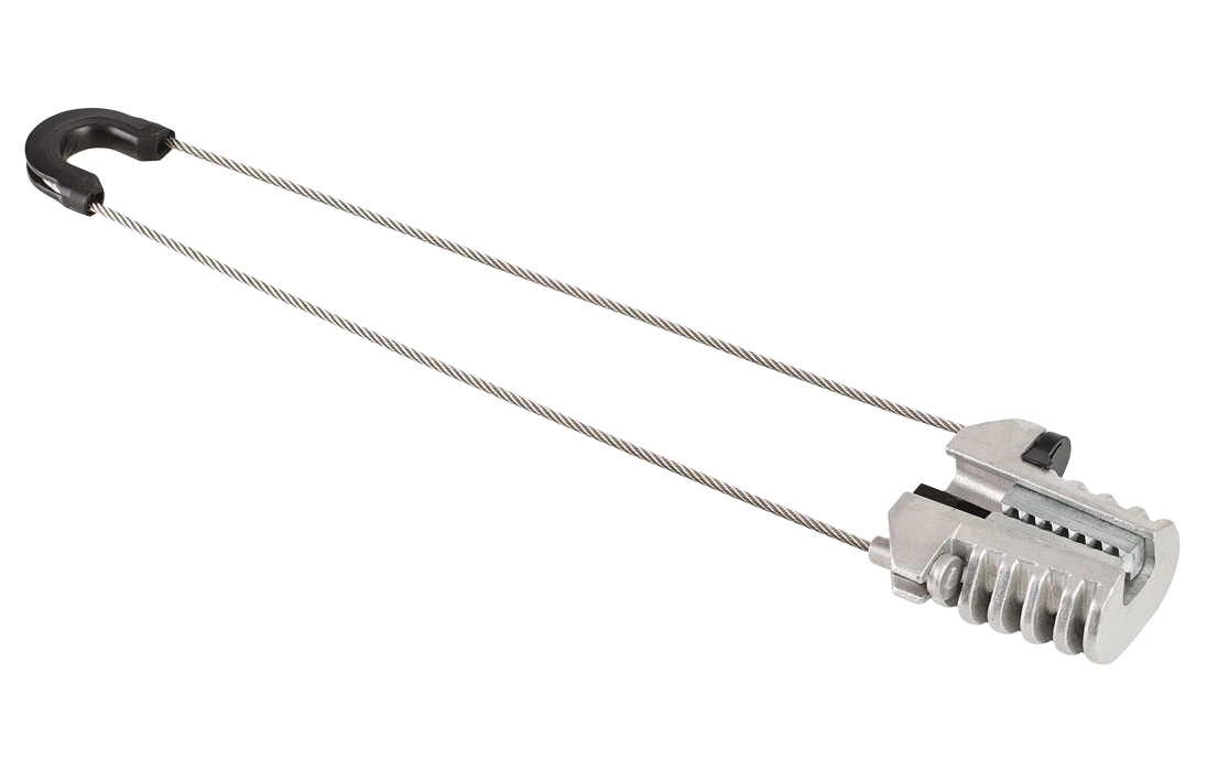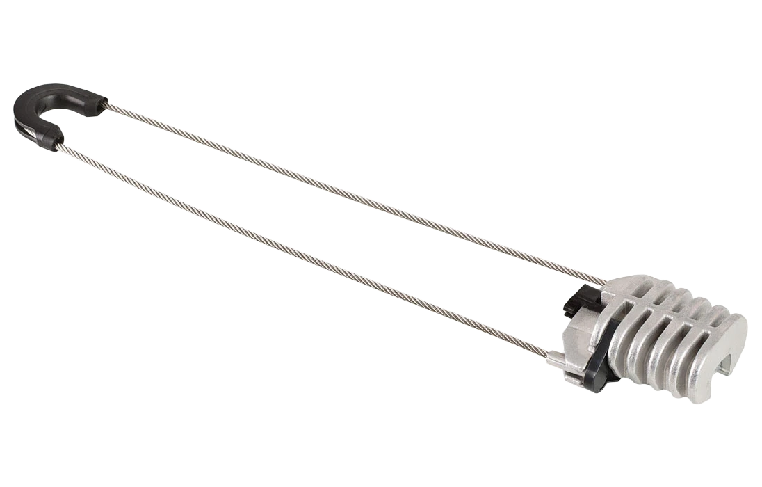 Предназначен для крепления и поддержки кабеля с обеспечением требуемого натяжения кабельной линии. Состоит из открытого конического корпуса, пары металлических зубчатых клиньев (зажимное устройство) и гибкой петли. Все детали соединены между собой и не могут быть утеряны. Устанавливается парами в начале, конце и в интервале 5-ти опор по протяженности кабельной линии. Обеспечивает значительное сокращение продолжительности процесса подвес кабеля.- Длина петли, мм: 520