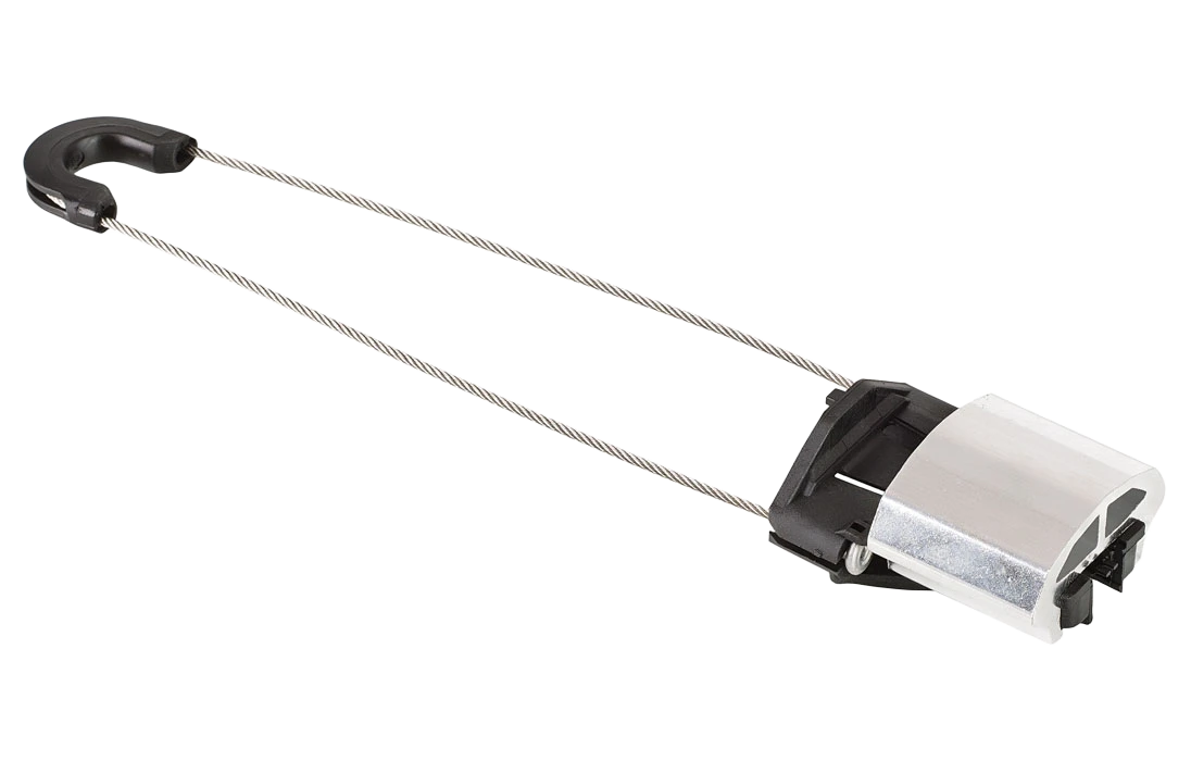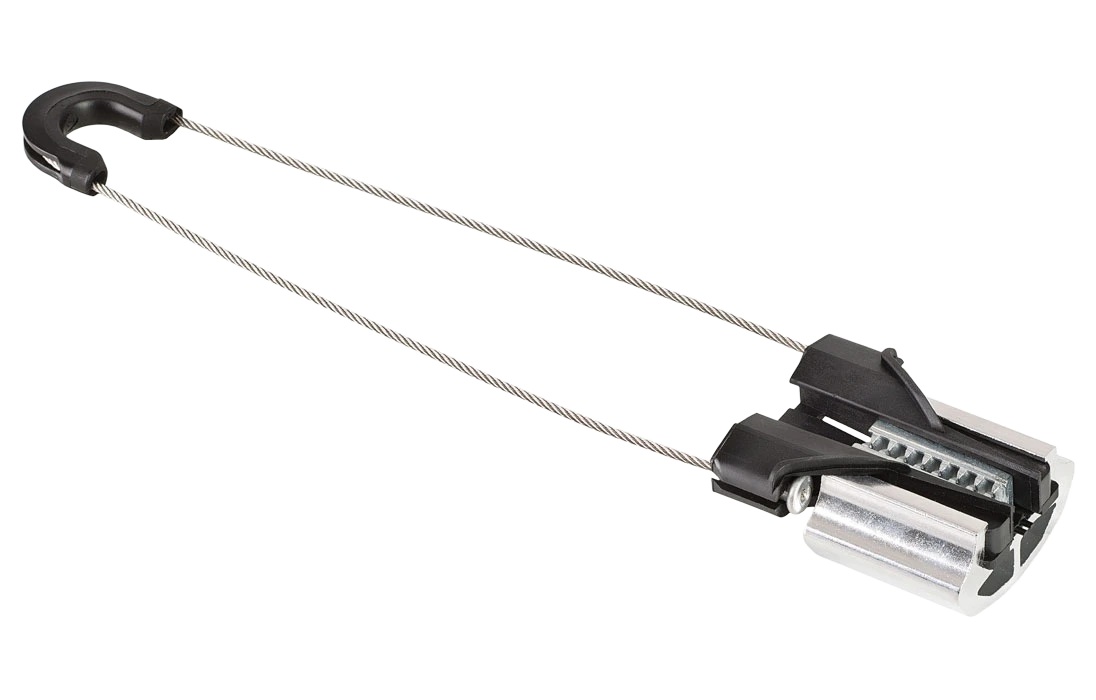Предназначен для крепления и поддержки кабеля с обеспечением требуемого натяжения кабельной линии. Состоит из открытого конического корпуса, пары металлических зубчатых клиньев (зажимное устройство) и гибкой петли. Все детали соединены между собой и не могут быть утеряны. Устанавливается парами в начале, конце и в интервале 5-ти опор по протяженности кабельной линии. Обеспечивает значительное сокращение продолжительности процесса подвес кабеля.- Длина петли, мм: 260