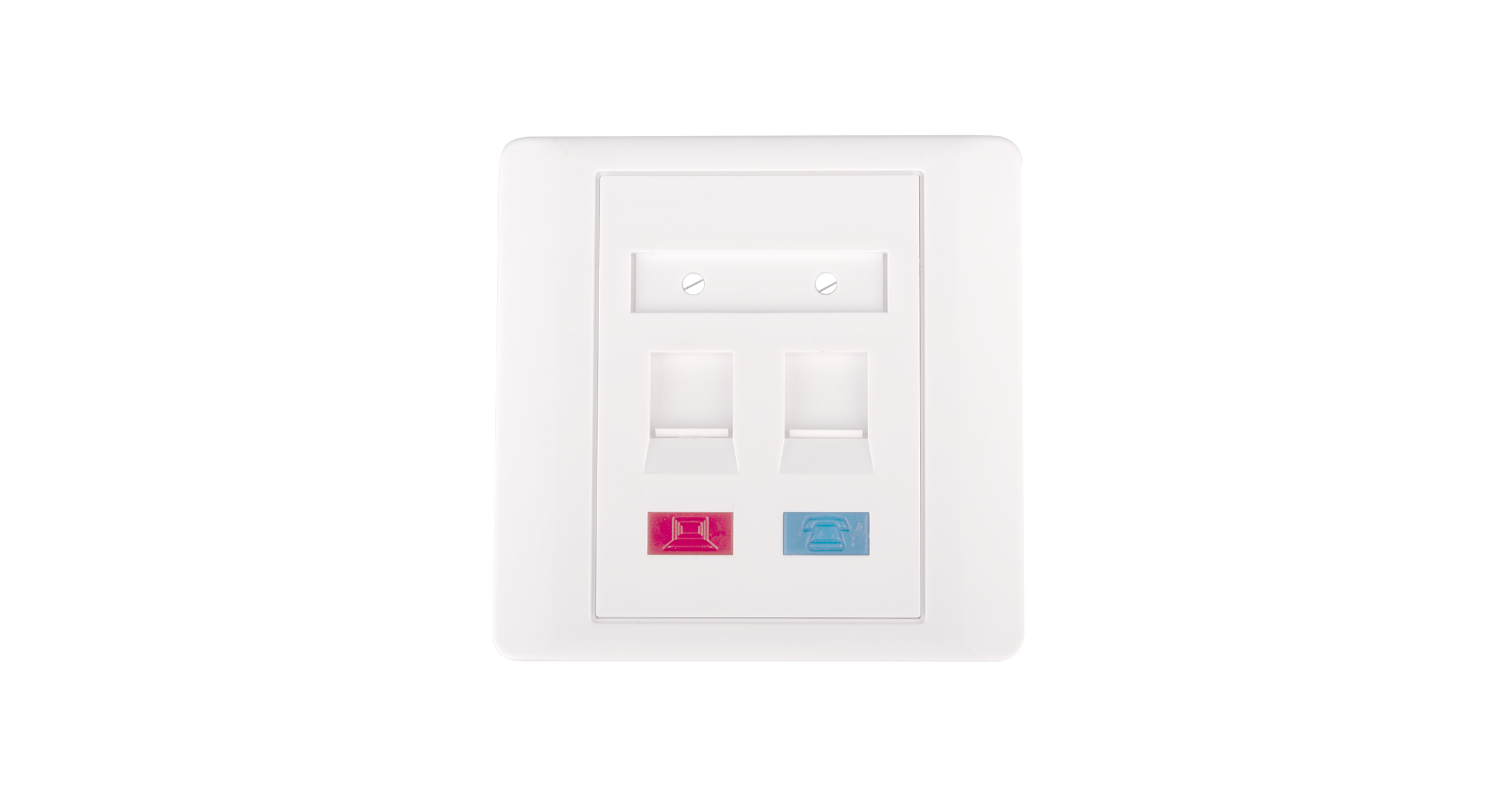 Для организации информационных портов на рабочем месте при помощи коробов, колонн и внутренних розеток применяется вставки 86х86 мм. В EC-FP-2KJ-WT-10 устанавливаются 2 модуля Keystone любого типа. Вставки снабжены шторкой для защиты гнезда от попадания пыли при отключенном коммутационном шнуре. В комплекте со вставками идет набор цветных иконок. Кроме этого имеются дополнительные площадки для маркировки, закрытые съемными прозрачными крышками.